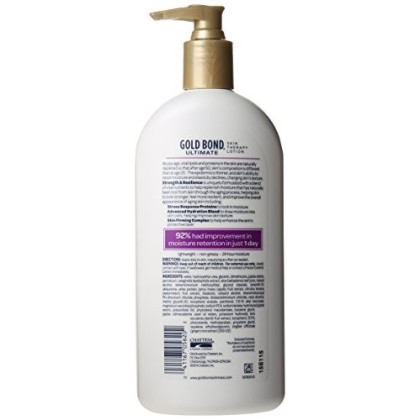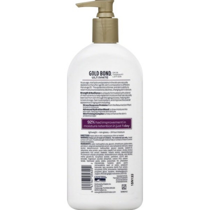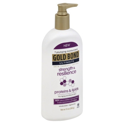 About This Item We aim to show you accurate product information. Manufacturers, suppliers and others provide what you see here, and we have not verified it. See our disclaimer GOLD BOND® Ultimate Strength & Resilience Lotion strengthens, increases resilience, and improves the texture of aging and mature skin. Over time, skin loses vital lipids and proteins, causing it to look old before its time, and the epidermis becomes thinner, hindering skin’s ability to retain moisture – leaving skin dry and dull looking. GOLD BOND® Ultimate Strength & Resilience is specially formulated for aging skin, with a blend of 7 plumping moisturizers and 3 vitamins with proteins and lipids to help replenish moisture that has been lost from skin through the aging process, helping skin look stronger and feel more resilient. This lotion is ideal for all over body use and is dermatologist tested, hypoallergenic, non-greasy, lightweight, fragrance free, and has 24 hour moisturization. GOLD BOND® Ultimate Strength & Resilience Lotion 13oz Strengthens, increases resilience, and improves the texture of aging and mature skin Specially formulated for aging skin Clinically tested, proven effective 84% saw a visible improvement in skin texture in just 5 days Contains 7 plumping moisturizers and 3 vitamins with proteins and lipids Dermatologist tested Hypoallergenic Non-greasy Fragrance Free 24hr moisturization