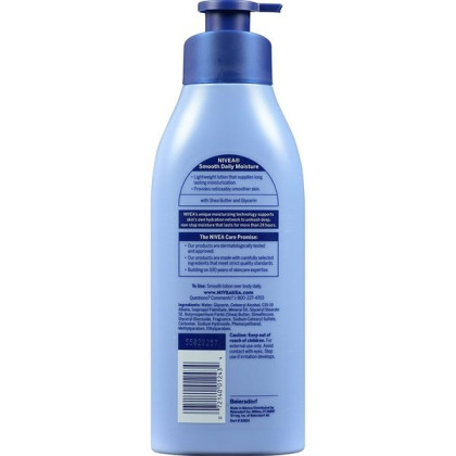 About This Item We aim to show you accurate product information. Manufacturers, suppliers and others provide what you see here, and we have not verified it. See our disclaimer Specifically formulated for dry skin, Smooth Sensation Lotion delivers intensive moisturization in a unique light, fast absorbing formula. Enriched with Ginkgo, Shea Butter and Vitamin E, it provides triple action moisturization for the most touchable skin youâ??ve ever imagined. How it works NIVEAâ??s exclusive Hydra IQ technology supports skinâ??s own hydration network to unleash deep, non-stop moisture that lasts more than 24 hours. Formerly known as "NIVEA Smooth Daily Moisture Body Lotion". You may receive either product depending on availability. 48 hour deep nourishing moisture Gently melts into skin leaving it silky and smooth, after just 1 application Locks in moisture & gives noticeably smoother skin Dermatologically tested and approved.