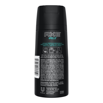 About This Item We aim to show you accurate product information. Manufacturers, suppliers and others provide what you see here, and we have not verified it. See our disclaimer AXE Body Spray for Men Apollo 4 oz is part of the Apollo male grooming range from AXE. It is a classically masculine, sophisticated fragrance with an addictive edge. Crisp notes of green fruits, sandalwood and fresh sage keep you smelling great. A few quick sprays of AXE Body Spray for men Apollo 4 oz is all you need. This unique premium deodorant body spray will keep you smelling great all day or all night. First twist the cap and then target your body and neck for a great smelling fragrance that makes a lasting impression. Boost your sweat and odor protection with AXE Antiperspirant Deodorant Stick for men 2.7 oz, get clean and fresh with AXE Body Wash for men 16 fl. Oz, and complete the range with AXE 2-in-1 Shampoo and Conditioner 12 fl oz â all available in Apollo. An AXE Deodorant Stick for Men 3 oz is also available in Apollo. And check out our other AXE body spray for men scents, like Phoenix, Essence, Dark Temptation, and Anarchy. FIND YOUR MAGIC with AXE Body Spray for men Apollo 4 oz from AXE Grooming For Men. Wondering why the can says AXE Daily Fragrance? AXE Body Spray for men is now known as AXE Daily Fragrance. The same great scents that you know and love, now with fresh redesigned packaging. AXE Apollo Body Spray for Men, 4 oz AXE Body Spray for Men, Apollo, 4 oz – A classically masculine, sophisticated fragrance with an addictive edge Crisp notes of green fruits, sandalwood and fresh sage keep you smelling great A unique fragrance in a 4 oz can A few sprays is all you need Use AXE anytime, smell great all the time Goes well with AXE Apollo Body Wash 16 fl oz, AXE Apollo Antiperspirant Deodorant stick 2.7 oz, and AXE Apollo 2-in-1 Shampoo+Conditioner 12 fl oz