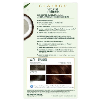 About This Item We aim to show you accurate product information. Manufacturers, suppliers and others provide what you see here, and we have not verified it. See our disclaimer Discover your natural way to shine! Made with 80% naturally derived ingredients, Clairol Natural Instincts gives you a rush of radiant, natural-looking color you can feel good about. Say "yes" to gentle ingredients like coconut oil and aloe vera and say "no" to ammonia and added parabens. Our no-drip crème formula is designed to feel more like a conditioner, and it's gentle on all hair types and textures. Treat yourself to color that blends away grays, boosts shine, and lasts up to 28 washes. Available in 37 natural shades, so you can find the black, brunette, blonde, or red hue that's totally you. Use the hair color chart below to find your ideal shade. Get a rush of color and boost of shine with 80% naturally derived ingredients No ammonia or added parabens Lasts 28 washes and blends away grays Available in 37 shades