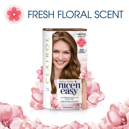 About This Item We aim to show you accurate product information. Manufacturers, suppliers and others provide what you see here, and we have not verified it. See our disclaimer Living is all about trying new experiences and feeling your best. So why waste time on bland, flat hair color? That's why Clairol Nice 'n Easy Permanent Hair Color gives you 8 weeks of true-to-you color with three salon tones for a blend of highlights and lowlights. Expertly designed to work with your unique hair, Nice 'n Easy offers salon-quality permanent hair color without the cost. Keep your color looking vibrant with Clairol CC+ ColorSeal Conditioner, which locks in softness and shine. To cover grays between colorings, try Nice 'n Easy Root Touch-Up to blend seamlessly with your color. For natural-looking color that's as real as you are, trust Clairol Nice 'n Easy hair color. Clairol Nice 'n Easy Hair Color, 6G Light Golden Brown