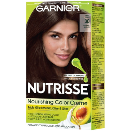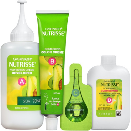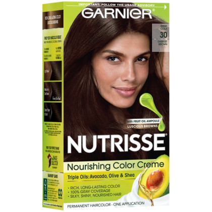 About This Item We aim to show you accurate product information. Manufacturers, suppliers and others provide what you see here, and we have not verified it. See our disclaimer Garnier Nutrisse Nourishing Hair Color Creme Garnier Nutrisse hair color creme nourishes while you color with avocado, olive, and shea oils. The nourishing color creme enriched with fruit oil concentrate, penetrates deep into hair fibers to nourish and condition your hair so it takes color better and holds it longer, root-to-tip. Garnier Nutrisse delivers rich, radiant, long-lasting hair color with 100% grey coverage. Permanent, nourishing hair color creme with three fruit oils- avocado, olive, and shea The only hair color creme with a separate ampoule of grape seed oil to start nourishing as you color Rich, radiant, long-lasting color with 100 percent grey coverage Available in 45 Nourishing Shades
