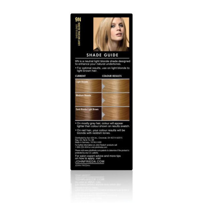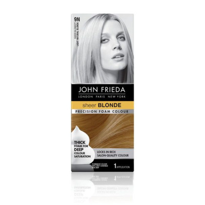 About This Item We aim to show you accurate product information. Manufacturers, suppliers and others provide what you see here, and we have not verified it. See our disclaimer Get salon-quality color with John Frieda Precision Foam Colour, 9N Light Natural Blonde. This home hair coloring system is a revolutionary departure than traditional kits that use liquid hair permanent hair dyes that can drip or miss entire sections of hair, resulting in messy, patchy results. Like most permanent hair colors, it provides outstanding grey coverage and includes a special after-care conditioner to help lock in color, but instead of liquid hair dye, the John Frieda Sheer Blonde system utilizes a foam colorant, traditionally only found in demi and semi-permanent color kits. The thick foam color penetrates each strand for deep color saturation that locks in rich color, for fade-resistant, salon-quality results. This non-drip formula, spreads quickly and easily into roots and hard-to-reach places for compete coverage without patchiness. The grey coverage hair color kit includes a nourishing after-color conditioner seals in color for long-lasting, tonal richness. John Frieda Sheer Blonde 9N Light Natural Blonde Precision Foam Colour, 1 Application: Thick foam for deep color saturation Locks in rich salon-quality color Permanent color John Frieda Sheer Blonde provides 100% grey coverage Nourishing after-color conditioner seals in color for long-lasting, tonal richness Non-drip No patches Fade resistant Kit includes: colourant, developer, conditioner, foamer, salon professional gloves and usage instructions Additional John Frieda grey coverage hair color shades sold separately