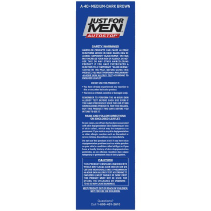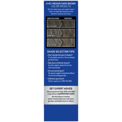 About This Item We aim to show you accurate product information. Manufacturers, suppliers and others provide what you see here, and we have not verified it. See our disclaimer For guys who want a foolproof way to get rid of gray hair color for natural looking results, there's Just For Men AutoStop. This easy comb-in, no mix, no mess formula only takes ten minutes to color every single gray hair, and lasts until the gray hair grows back. Just For Men AutoStop comes in many natural looking shades, so it's easy to find the one that truly matches your natural hair color. Can't decide between two shades? Try the lighter one first. You can always go darker later. Just For Men AutoStop Real Black Easy Comb-in, No-Mix Men's Hair Color Gets rid of gray hair. And it is foolproof, because it can't go too dark This men’s hair dye formula contains no peroxide and no ammonia, gently changing hair color Lasts for up to 8 weeks, or until your grey hair grows back