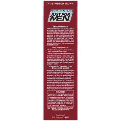 About This Item We aim to show you accurate product information. Manufacturers, suppliers and others provide what you see here, and we have not verified it. See our disclaimer Just For Men Mustache & Beard hair color brings out the best in your facial hair. Facial hair looks fuller, more even and well-groomed as you get rid of the scraggly look of gray facial hairs. The fast and easy brush-in gel works in 5 minutes - your gray hair will be gone until it grows back. This ammonia-free formula is made specifically to penetrate and condition coarse facial hair. Just For Men Mustache and Beard hair color contains protein, Vitamin E, aloe and chamomile that nourishes your hair while you color. It leaves your facial hair looking well groomed, conditioned and thicker after every application. Its ammonia free formula causes no damage to your hair. Can't decide between two shades? Try the lighter one first. You can always go darker later. Just For Men Mustache & Beard, Darkest Brown Eliminates gray hairs for a thicker, fuller look Works in 5 easy minutes Easy Brush-In Application Just For Men Beard & Mustache is specially formulated to penetrate coarse facial hair