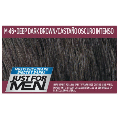 About This Item We aim to show you accurate product information. Manufacturers, suppliers and others provide what you see here, and we have not verified it. See our disclaimer Just For Men Mustache & Beard hair color brings out the best in your facial hair. Facial hair looks fuller, more even and well-groomed as you get rid of the scraggly look of gray facial hairs. The fast and easy brush-in gel works in 5 minutes - your gray hair will be gone until it grows back. This ammonia-free formula is made specifically to penetrate and condition coarse facial hair. Just For Men Mustache and Beard hair color contains protein, Vitamin E, aloe and chamomile that nourishes your hair while you color. It leaves your facial hair looking well groomed, conditioned and thicker after every application. Its ammonia free formula causes no damage to your hair. Can't decide between two shades? Try the lighter one first. You can always go darker later. Just For Men Mustache & Beard, Darkest Brown Eliminates gray hairs for a thicker, fuller look Works in 5 easy minutes Easy Brush-In Application Just For Men Beard & Mustache is specially formulated to penetrate coarse facial hair
