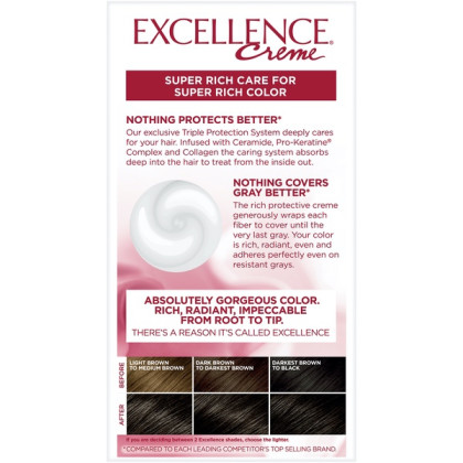 About This Item We aim to show you accurate product information. Manufacturers, suppliers and others provide what you see here, and we have not verified it. See our disclaimer L'Oreal Paris Excellence Creme There's a reason it's called Excellence. Nothing protects or covers grays better*. L'Oreal Excellence Cr?me's Exclusive Triple Protection System seals, replenishes and conditions your hair for up to 8 weeks of protection. All that, and 100% gray hair coverage, even on stubborn grays.*compared to each leading competitor's top selling brand. Super Rich Care Super Rich Color 100 Percent Long-Lasting Gray Coverage