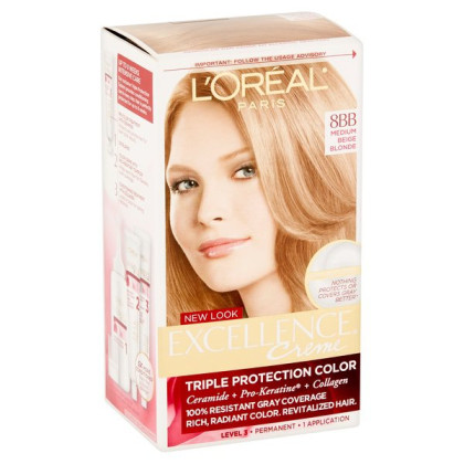 About This Item We aim to show you accurate product information. Manufacturers, suppliers and others provide what you see here, and we have not verified it. See our disclaimer Get a salon-quality finish in the comfort of your home with the L'Oreal Paris Excellence Creme Hair Color. Discover excellence creme lights. The gentle, non-drip formula lets you create creamy, beautifully blended highlights in a few simple steps. This permanent hair color delivers triple protection permanent hair color that revitalizes and protects hair from the inside and out. The results—rich, radiant highlights and not a gray in sight. It also offers longer-lasting gray coverage compared to the leading competitor's brand. The beige blond hair color is also available in other shades, so you can find one that suits your preference. L'Oreal Paris Excellence Creme Hair Color, 8BB Medium Beige Blonde, 1 Kit: Permanent hair col0r comes in 01 Extra Light Ash Blonde, 02 Extra Light Natural Blonde, 1 Black, 1BB Velvet Black, 1C Cool Black, 1N Rich Black, 2.0 Soft Black, 2B Intense Blue Black, 2C Luscious Black, 3 Natural Black and many more shades 1 application per package Features ceramides, plus Pro-Keratine and collagen to bind to the strands Delivers 100% coverage of gray hair Lasts for up to 8 weeks