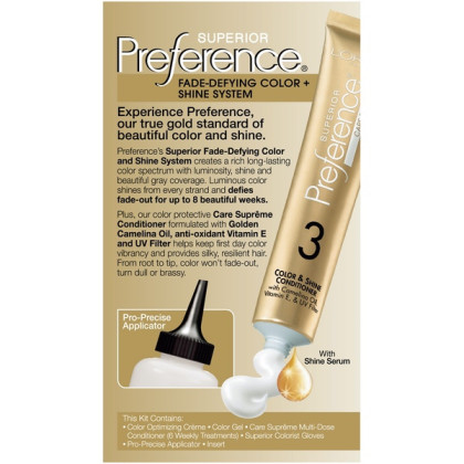 About This Item We aim to show you accurate product information. Manufacturers, suppliers and others provide what you see here, and we have not verified it. See our disclaimer L'Oreal Paris Superior Preference Fade-Defying Color + Shine System Since 1973, L'Oreal Superior Preference has been our gold standard in permanent hair color - delivering extraordinary shine and luminous hair color that lasts and lasts. What makes Superior Preference hair color so special is our unique Fade-Defying Color and Shine System that pairs our translucent gel formula with our famous Care Supreme Conditioning treatment. The end result is beautifully crafted, long lasting hair color with depth and dimension. Available in over 50 luminous shades so you can find your own signature color. Our Gold Standard Since 1973 Fade-Defying Color and Shine Available In Over 50 Luminous Shades