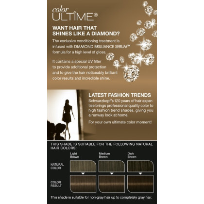 About This Item We aim to show you accurate product information. Manufacturers, suppliers and others provide what you see here, and we have not verified it. See our disclaimer Experience sublime care for your hair formulated with Intensive Care Elixir with pearl essence. For shiny hair luxuriously soft to touch, hair dye available in vibrant colors in these high definition shades: Deep Brunettes, Iconic Blondes, Luminous Blacks, Flaming Reds, and Glowing Coppers. INTENSE COLOR: The breakthrough formula of Color Ultime hair colorations provide vivid color intensity and premium performance for noticeably brilliant color results. FADE RESISTANT: The advanced, premium formula of Color Ultime hair dye defies fading for lasting vibrancy for up to 9 weeks! SHINE LIKE A DIAMOND: Color Ultime hair colorations provide lasting, incredible shine that is sure to stop the show! IN THE BOX: 1 tube color cream, 1 application bottle with developer lotion, 1 tube conditioning treatment, 1 pair of gloves, and 1 instruction leaflet If your hair is longer than shoulder length, we recommend using 2 boxes of Color Ultime hair dye for the application.