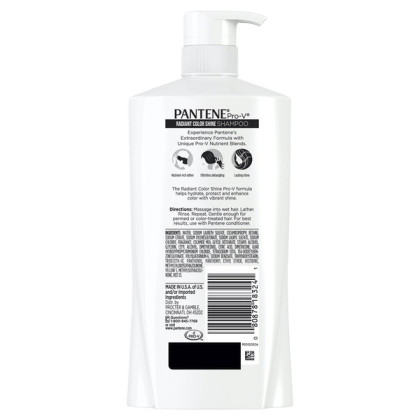 About This Item We aim to show you accurate product information. Manufacturers, suppliers and others provide what you see here, and we have not verified it. See our disclaimer Get up to 6 weeks of brilliant color* with Radiant Color Shine Shampoo. The powerful Pro-V formula wraps every strand as it gently cleanses, adds moisture and gives hair brilliant shine. With Pantene Pro-V Radiant Color Shine, youll get lasting color* and your hair will feel healthy as its hydrated from root to tip. *Radiant Color Shine shampoo and conditioner system vs. non-conditioning shampoo. Pantene Pro-V Radiant Color Shine Shampoo, 25 fl oz: Radiant Color Shine Shampoo nourishes hair with a blend of Pro-V nutrients and antioxidants so hair is strong against damage Delivers up to 6 weeks of brilliant color* (*Radiant Color Shine shampoo and conditioner system vs. non-conditioning shampoo) Luxurious formula made for color-treated hair with a nutrient-rich lather that wraps every strand for all-day lasting shine Powerful Pro-V formula hydrates and nourishes for natural shine and touchably soft hair Brings shine to color-treated hair