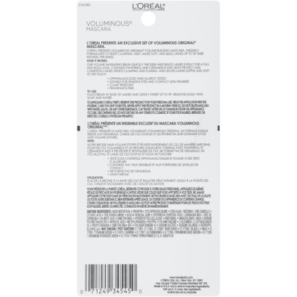 About This Item We aim to show you accurate product information. Manufacturers, suppliers and others provide what you see here, and we have not verified it. See our disclaimer L'Oral Paris Voluminous Mascara Exclusive L'Oral Paris presents an exclusive set of Voluminous Original Mascara. Uniquely formulated to resist clumping, keep lashes soft, and build lashes up to 5x their natural thickness. Our Volume Maximizing Brush quickly thickens and builds lashes evenly for a full and bold look. Contains Panthenol and Ceramide-R and helps protect and condition lashes. Resists clumping and flaking, and leaves lashes supple and soft to the touch. Bold, volume building mascara Up to 5x fuller lashes Separates and builds every lash Creamy formula