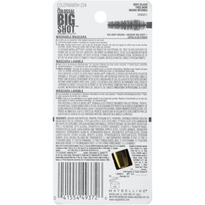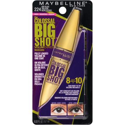 About This Item We aim to show you accurate product information. Manufacturers, suppliers and others provide what you see here, and we have not verified it. See our disclaimer Turn up the volume on your lashes with Maybelline Colossal Big Shot Mascara. Nothing boosts lashes quite like Maybelline Colossal Big Shot, delivering fully-loaded volume in one coat without flaking or smudging. The formulation is so powerful, eight out of 10 users saw visibly thicker, bolder lashes after use. The black mascara includes an exclusive brush with wavy bristles that grip each eyelash for superior results. The mascara is ophthalmologist-tested to ensure safe use for contact lens wearers. The washable mascara is flake-free and won't smudge, for lashes that really go the distance. It removes effortlessly without tugging or pulling with eye make up remover or just mild cream cleanser. Choose from three different shades. Maybelline Volum' Express The Colossal Big Shot Washable Mascara, 224 Very Black: Root to tip volume instantly Big Shot brush features unique, wavy bristles that cradle lashes for a bold lash look, evenly distributing mascara Washable mascara formula No flake, no smudge formula removes easily without tugging or pulling Lashes go powerful with Colossal Big Shot, 8 out of 10 users saw bigger bolder volume Ophthalmologist-tested to ensure safe use for contact-lens wearers Easy to use, sweep brush from root to tip Please note: packaging may vary, what you receive may not be what is reflected on site Choose from colors: 223 Blackest Black, 224 Very Black and 225 Brownish Black