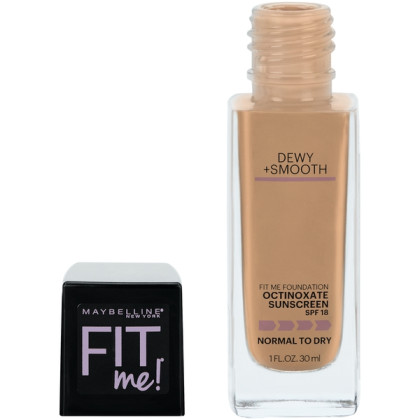 About This Item We aim to show you accurate product information. Manufacturers, suppliers and others provide what you see here, and we have not verified it. See our disclaimer Get smooth, hydrated, and even skin tone with Fit Me Dewy + Smooth foundation. Formulated to deliver hydrated and smooth skin with a natural luminous finish. Also, this foundation makeup has the added benefit of sun protection SPF 18. The end result is beautifully dewy and smooth skin with a shade that fits you. Dermatologist tested. Allergy tested. Non-comedogenic. Fragrance-free. Packaging may vary, what you receive may not be what is reflected on site. Dewy and smooth foundation makeup with spf 18 Hydrating foundation smoothes skin's texture Leaves a naturally luminous finish Moisturizing foundation ideal for normal to dry skin Apply foundation onto skin and blend with fingertips or an applicator and blend. For external use only. Dewy and smooth foundation makeup with SPF 18 Hydrating foundation smoothes skin's texture Leaves a naturally luminous finish Moisturizing foundation ideal for normal to dry skin