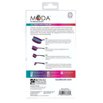 About This Item We aim to show you accurate product information. Manufacturers, suppliers and others provide what you see here, and we have not verified it. See our disclaimer Create a flawless complexion with the MŌDA® Prismatic Face Perfecting Kit! These dense, ultra-soft brushes apply and blend cream and liquid makeup with minimal absorption, leaving more makeup for application. The unique shapes are designed to fit the contours of your face for optimal blending. The kit includes: #801: Use this large brush for all over cream or liquid foundation application. Move the brush in one fluid movement over your face to apply and blend. #802: Ideal for blush or bronzer application for a stunning glow. #803: Create a flawlessly blended contour under your cheekbones, along your jawline, or at the hairline. #804: This small brush is perfect for precisely applying concealer, blending makeup under your eyes, or for contouring your nose or other small areas of the face. Product Features Cruelty-free 100% Vegan No animal products used Excellent for blending foundation, concealer, moisturizer, and primer Waterproof handles Sturdy, flexible handle for precise application Dense soft fibers Follow @modabrush on Instagram!