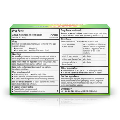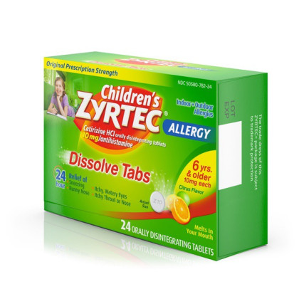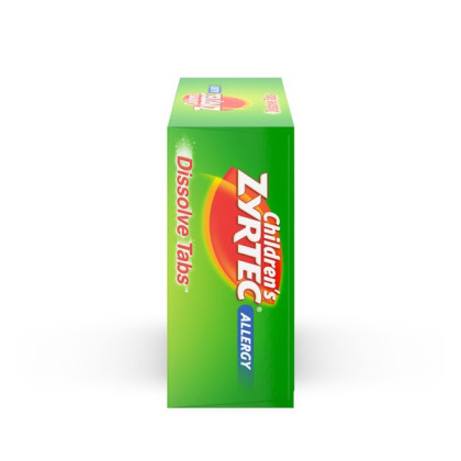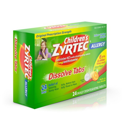 About This Item We aim to show you accurate product information. Manufacturers, suppliers and others provide what you see here, and we have not verified it. See our disclaimer Give your child effective relief from allergy symptoms caused by hay fever and other upper respiratory allergies with Children's Zyrtec Allergy Dissolve Tablets. This prescription-strength allergy medicine for kids provides 24-hour relief of runny nose, sneezing, itchy and watery eyes, and itching of the nose and throat. With 10 milligrams of cetirizine hydrochloride in each tablet, this children's allergy medicine melts in the mouth with a kid-friendly citrus flavor. Intended for children 6 years and older, Zyrtec allergy tablets provide consistently powerful allergy relief for your kids' allergies and can be taken with or without water. 24-ct. bottle of Children's Zyrtec 24 Hour Allergy Dissolve Tablets for all-day allergy relief Kids' allergy tablets relieve symptoms like runny nose, sneezing, itchy, watery eyes, and itchy nose & throat. Each allergy tablet contains 10 milligrams of effective cetirizine hydrochloride antihistamine Give your child 24 hours of relief with this prescription-strength allergy medicine for kids These children's allergy relief tablets melt in the mouth with a kid-friendly citrus flavor Children's allergy medicine provides effective relief from hay fever and seasonal allergies For children ages 6 and older, these kids' allergy tablets can be taken with or without water Zyrtec children's dissolving tablets provide consistently powerful relief for your kids' allergies