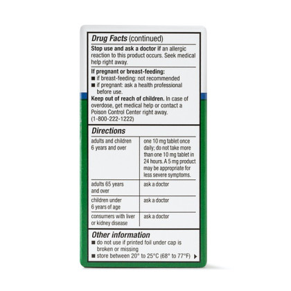 About This Item We aim to show you accurate product information. Manufacturers, suppliers and others provide what you see here, and we have not verified it. See our disclaimer Compare to Zyrtec® active ingredient. Cetirizine Hydrochloride Tablets, 10 mg active ingredient is Cetirizine Hydrochloride, 10 mg, an antihistamine approved for the treatment of both indoor and outdoor allergy symptoms. One dose works for a full 24 hours. Temporarily relieves indoor and outdoor allergy symptoms in adults and children 6 years and over. Each tablet contains 10 mg of Cetirizine Hydrochloride. Original prescription strength. All-day allergy relief. For indoor & outdoor allergies. 24-hour relief of: sneezing; runny nose; itchy, watery eyes; itchy throat or nose. Equate Cetirizine 10MG, 90 count: Equate's Allergy Relief active ingredient is Cetirizine Hydrochloride 10 mg, an antihistamine approved for the treatment of both indoor and outdoor allergy symptoms. One dose of Cetirizine Hydrochloride works for a full 24 hours. Allergy Relief is approved to temporarily relieve indoor and outdoor allergy symptoms in adults and children 6 years and over. Each tablet contains 10 mg of Cetirizine Hydrochloride. Original prescription strength. All day allergy relief. For indoor & outdoor allergies. 24 hour relief of: sneezing runny nose itchy, watery eyes itchy throat or nose Cetirizine Hydrochloride is the #1 Allergist Recommended Adult Oral Antihistamine OTC Active Ingredient* *Of U.S. physicians surveyed by an independent market research firm