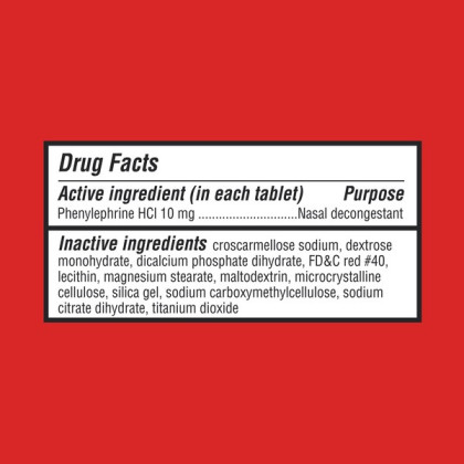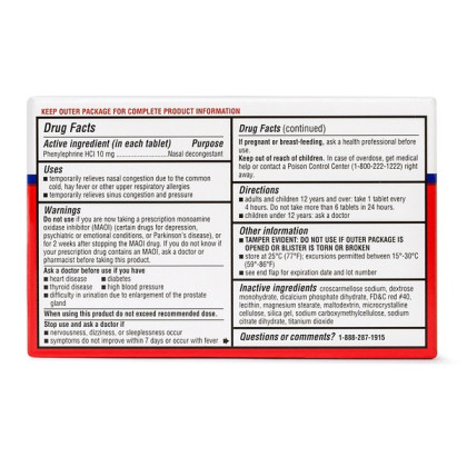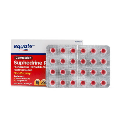 About This Item We aim to show you accurate product information. Manufacturers, suppliers and others provide what you see here, and we have not verified it. See our disclaimer Treat seasonal allergies and head colds with Equate Congestion Suphedrine PE Nasal Decongestant Tablets. Making the right health decisions can be challenging, as well as costly. With a complete range of products and simple solutions, Equate makes it easy to find exactly what you need to treat everything from the common cold to aches and pains, at price points that don't break the bank. Equate nasal decongestant temporarily relieve sinus congestion and pressure due to the common cold, hay fever or other upper respiratory allergies. They have a non-drowsy formula, so they're easy to take whenever needed, including during daytime hours. The principle ingredient, phenylephrine HCI 10mg, effectively targets the sinus cavity to ameliorate runny nose, sneezing, sniffling, pain and pressure. Each box contains 72 coated tablets. Equate Congestion Suphedrine PE Nasal Decongestant Tablets, 10mg, 72-Count: Non-drowsy formula ideal for daytime use Equate nasal decongestant provides temporary relief Temporarily relieves sinus congestion and pressure due to the common cold, hay fever or other upper respiratory allergies Active ingredient: phenylephrine HCI 10mg Coated tablets for easy swallowing 72-count pack