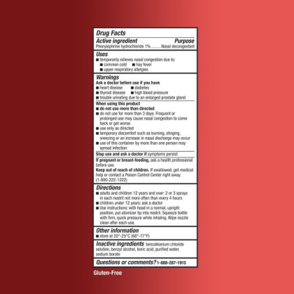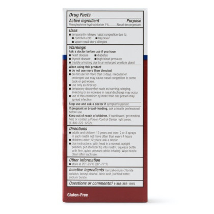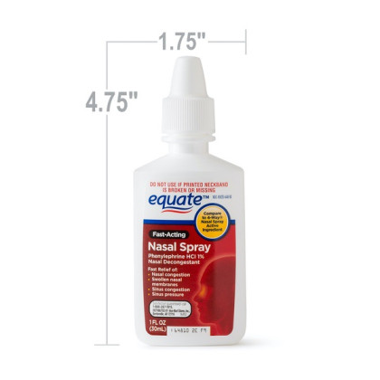 About This Item We aim to show you accurate product information. Manufacturers, suppliers and others provide what you see here, and we have not verified it. See our disclaimer If you're having breathing problems due to being sick with the flu or a cold, turn to the power of Equate Fast Acting Nasal Spray Solution. This health accessory provides fast and effective relief from the discomforts of blocked sinuses. Equate nasal spray contains phenylephrine hydrochloride as its active ingredient. Its fast-acting nasal power provides immediate relief from sinus congestion, sinus pressure and swollen nasal membranes due to hay fever, the common cold and upper respiratory allergies. It's also gluten-free. Making the right health decisions can be challenging. With a complete range of products and simple solutions like this 1-oz package of nasal decongestant spray, Equate allows you to take care of your family with confidence. When you feel the symptoms coming on, simply put one spray or spritz up your nose and feel immediate relief as those sinus passages open. This compares to the active ingredient found in 4-Way Nasal Spray. So turn to a trusted name in cold and sinus relief and fix your nose with Equate Fast Acting Nasal Spray Solution. Equate Fast Acting Nasal Spray Solution, 1 oz: Fast relief of nasal congestion, swollen nasal membranes, sinus congestion, sinus pressure Active ingredient: phenylephrine hydrochloride 1% Equate nasal spray temporarily relieves congestion due to common cold, hay fever, upper respiratory allergies Gluten-free Compares to 4-Way Nasal Spray active ingredient Feel immediate relief as sinus passages open upon spraying ABOUT FAST-ACTING NASAL SPRAY Compare to 4-Way® Nasal Spray active ingredient Fast-Acting Nasal Spray, Phenylephrine HCl 1%, is used for the temporary relief of congestion or stuffiness in the nose caused by hay fever or other upper respiratory allergies or colds.