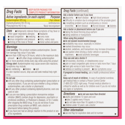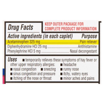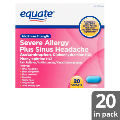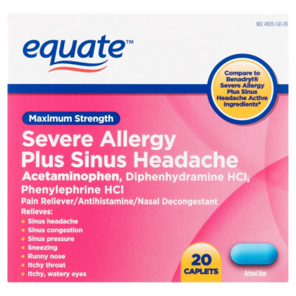 About This Item We aim to show you accurate product information. Manufacturers, suppliers and others provide what you see here, and we have not verified it. See our disclaimer Uses ■ temporarily relieves these symptoms of hay fever or other upper respiratory allergies: ■ headache ■ nasal congestion ■ sneezing ■ runny nose ■ sinus congestion and pressure ■ itchy, watery eyes ■ itching of the nose or throat ■ minor aches and pains Drug Facts Active ingredients (in each caplet) - Purpose Acetaminophen 325 mg - Pain reliever Diphenhydramine HCl 25 mg - Antihistamine Phenylephrine HCl 5 mg - Nasal decongestant Get relief from allergies and sinus headaches with Equate Maximum Strength Severe Allergy Plus Sinus Headache Caplets. These maximum strength caplets work as a pain reliever, an antihistamine, and a nasal decongestant all in one dose. This medicine can help you when you experience allergy symptoms such as sinus headaches, congestion, and pressure, as well as sneezing, runny nose, itchy throat, and itchy, watery eyes from allergic reactions. Each caplet is power packed with 325 milligrams of acetaminophen, a powerful pain reliever, as well as 25 milligrams of diphenhydramine, a strong antihistamine, and 5 milligrams of phenylephrine that works on nasal congestion. These caplets are safe for children age 12 and over. Get past your allergy and sinus troubles fast with Equate Maximum Strength Severe Allergy Plus Sinus Headache Caplets. 325mg acetaminophen per caplet 25mg diphenhydramine per caplet 5mg phenylephrine per caplet 20 caplets per container Compare to the active ingredients in more costly brands