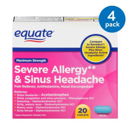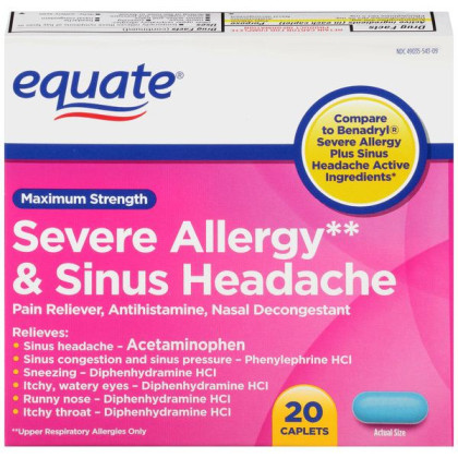 About This Item We aim to show you accurate product information. Manufacturers, suppliers and others provide what you see here, and we have not verified it. See our disclaimer Uses ■ temporarily relieves these symptoms of hay fever or other upper respiratory allergies: ■ headache ■ nasal congestion ■ sneezing ■ runny nose ■ sinus congestion and pressure ■ itchy, watery eyes ■ itching of the nose or throat ■ minor aches and pains Drug Facts Active ingredients (in each caplet) - Purpose Acetaminophen 325 mg - Pain reliever Diphenhydramine HCl 25 mg - Antihistamine Phenylephrine HCl 5 mg - Nasal decongestant Get relief from allergies and sinus headaches with Equate Maximum Strength Severe Allergy Plus Sinus Headache Caplets. These maximum strength caplets work as a pain reliever, an antihistamine, and a nasal decongestant all in one dose. This medicine can help you when you experience allergy symptoms such as sinus headaches, congestion, and pressure, as well as sneezing, runny nose, itchy throat, and itchy, watery eyes from allergic reactions. Each caplet is power packed with 325 milligrams of acetaminophen, a powerful pain reliever, as well as 25 milligrams of diphenhydramine, a strong antihistamine, and 5 milligrams of phenylephrine that works on nasal congestion. These caplets are safe for children age 12 and over. Get past your allergy and sinus troubles fast with Equate Maximum Strength Severe Allergy Plus Sinus Headache Caplets. 325mg acetaminophen per caplet 25mg diphenhydramine per caplet 5mg phenylephrine per caplet 20 caplets per container Compare to the active ingredients in more costly brands