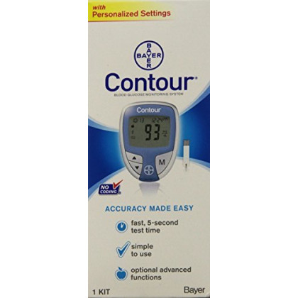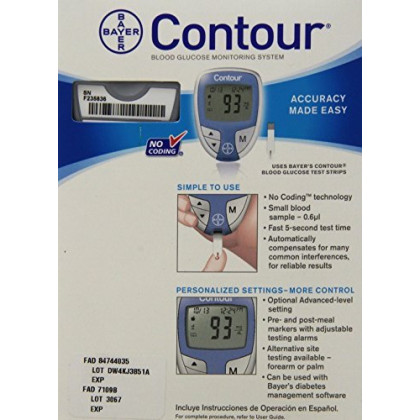 About This Item We aim to show you accurate product information. Manufacturers, suppliers and others provide what you see here, and we have not verified it. See our disclaimer With no coding required, the Bayer Contour Blood Glucose Meter, Blue lets you skip a step, so testing your sugar levels is made simpler and faster. Since this diabetic monitoring system only needs a 0.6 micro liter blood sample, your testing experience is gentler and less painful. Plus, the easy-to-use blood glucose meter features a large memory that stores up to 480 test results. With a large numeric display on the monitor, this glucometer helps you see your test results clearly. Plus the monitor is easy to hold, making this blood sugar tester portable and ready to use at a moment's notice. If you don't like taking samples from your finger, this glucose monitor kit allows you to alternate the testing site from different areas on your body, for a more customized and comfortable way to test your glucose levels. Active Ingredients: Test Strip Reagents: 6% W/W FAD Glucose Dehydrogenase (Aspergillus Sp., 2.0 U/Test Strip); 56% W/W Potassium Ferricyanide; 38% Non-Reactive Ingredients. Normal Control Reagents: 0.12% W/V Glucose; 99.88% W/V Non-Reactive Ingredients Uses: Simple To Use: No Coding technology. Small blood sample - 0.6 microliter. Fast 5-second test time. Automatically compensates for common interferences, for reliable results. Personalized Settings - More Control: NEW optional advanced-level setting. NEW pre- and post-meal markers with adjustable testing alarms. Alternative site testing available - forearm or palm. Can be used with Bayer's Diabetes Management Software. For self-monitoring and management of blood glucose. This kit contains everything you need to start blood glucose monitoring with Bayer's CONTOUR System: blood glucose meter; 10 blood glucose test strips; normal control; quick reference guide; user guide; Bayer's lancing device, alternative site endcap, adjustable endcap, 10 lancets; Bayer's CLINILOG log book; carrying case; warranty card.