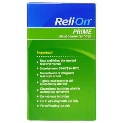 About This Item We aim to show you accurate product information. Manufacturers, suppliers and others provide what you see here, and we have not verified it. See our disclaimer ReliOn Prime Blood Glucose Test Strips are designed to give reliable results. They're easy to use on the fingertip or palm and require no coding. These blood test strips are compatible with ReliOn Prime glucose meters only. ReliOn understands all the ways diabetes touches your life. With affordable, reliable products and total lifestyle support, ReliOn helps you be your best you. ReliOn Prime Blood Glucose Test Strips: 100-count ReliOn test strips are easy to handle Test on fingertip and/or palm No coding required Small sample size Proven accuracy Designed to work with ReliOn Prime glucose meters only Check your blood glucose levels daily with ease