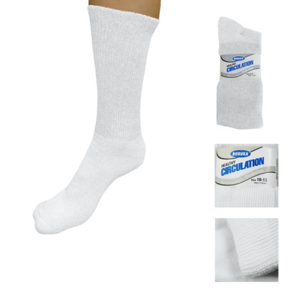 About This Item We aim to show you accurate product information. Manufacturers, suppliers and others provide what you see here, and we have not verified it. See our disclaimer 6 Pairs Of White Diabetic Healthy Circulation Men's Women's Crew Socks Size10-13 ! The 3 pairs of white unisex circulation diabetic crew socks are made for those whosuffer from diabetes, edema and or swollen feet. It provides neuropathy comfort support and better circulation. The non-binding, loose-fitting top allows for optimal circulation flow Delicate cotton blend, for extra comfort made with 88% cotton 10% nylon. 2% elastic. Full cushion lining with heel and toe support for pressure relief and maximum foot protection Available in size 10-13. Not only do these socks aid in your health needs but the cushioningalong the bottom provides additional comfort. Machine wash warm, do not bleach, tumble dry low. Please note sock fits a bit snug. 6 Pairs Diabetic Crew Circulatory Socks Health Support Mens Loose Fit Size 10-13