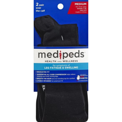 About This Item We aim to show you accurate product information. Manufacturers, suppliers and others provide what you see here, and we have not verified it. See our disclaimer MediPeds Nylon Over the Calf Crew Socks provide the support you need for all-day comfort. Specially designed for those with circulatory issues or swelling and fatigue in the ankle or calf, they're made of soft and stretchy nylon. Their graduated sizing fits snugly in the right places with moderate compression, improving blood flow and circulation through the legs and the feet. This provides comfortable support during normal activities or when sitting or standing for extended periods. An extra-wide top makes them easier to put on and to take off. This package contains 2 pairs of circulatory socks that fit both men's and women's shoe sizes. MediPeds Circulatory Sock, 2 Pairs: Designed for relief of leg fatigue and swelling Graduated fit All-day support Nylon over the calf Extra-wide top Medium size Fits women's shoe sizes 7 to 10 and men's shoe sizes 6 to 9 Mild compression MediPeds crew socks help to improve circulation Country of Origin: United States