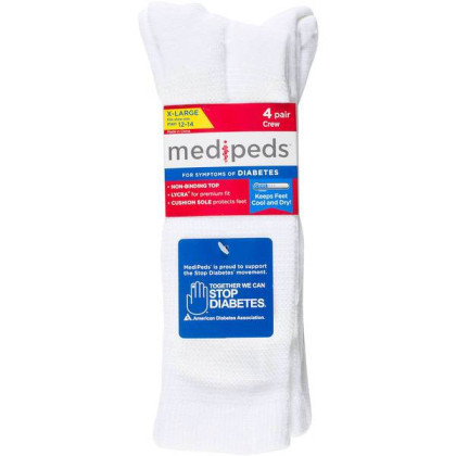 About This Item We aim to show you accurate product information. Manufacturers, suppliers and others provide what you see here, and we have not verified it. See our disclaimer Get the comfort of cushioned sole socks with the MediPeds Mens COOLMAX Crew, 4-Pack. They have moisture wicking to help keep feet cool, dry, and comfortable. These MediPeds socks have a non-binding top with extra stretch and comfort as well as have a smooth toe seam that reduces pressure points. The men's cushion socks has stretch fiber that hugs your foot for better fit and comes in a convenient pack of four. COOLMAX fiber keeps feet cool, dry, and comfortable Stretch fiber hugs your foot for perfect fit Non-binding top with extra stretch and comfort Cushion sole protects feet and provides additional comfort Smooth toe seam reduces pressure points 66% Polyester, 30% COOLMAX Polyester, 2% LYCRA Fiber, 2% Nylon Country of Origin: United States