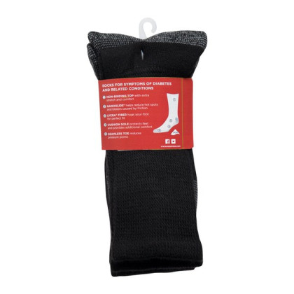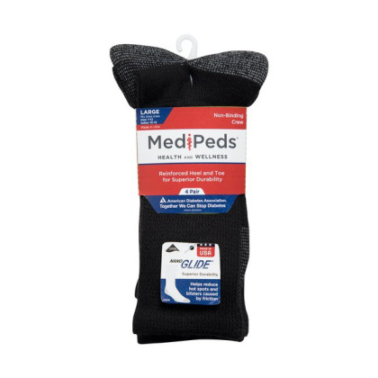 About This Item We aim to show you accurate product information. Manufacturers, suppliers and others provide what you see here, and we have not verified it. See our disclaimer Get the comfort of cushioned sole socks with the MediPeds Mens NanoGLIDE Crew, 4-Pack. They have NanoGLIDE technology that helps reduce hot spots and blisters caused by friction. These MediPeds socks have a reinforced heel and toe for superior durability, a non-binding top with extra stretch and comfort, and a seamless toe that reduces pressure points. The men's cushion socks has stretch fiber that hugs your foot for better fit and comes in a convenient pack of four. NanoGLIDE helps reduce hot spots and blisters caused by friction Reinforced heel and toe for superior durability Non-binding top with extra stretch and comfort Stretch fiber hugs your foot for perfect fit Cushion sole protects feet and provides additional comfort Seamless toe reduces pressure points 57% Polyester, 36% Acrylic, 5% Nylon, 2% LYCRA Fiber