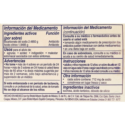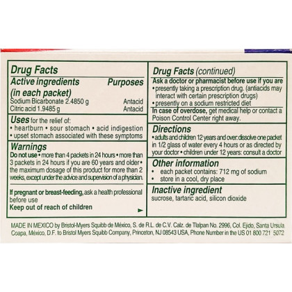 One packet contains over 30% of the recommended allotment of sodium. If you have high blood pressure, you might want to consider another solution. Or just take a couple of swallows. That said, it is useful because Alka Seltzer doesnt seem to be available without a pain reliever in it. This contains only bicarb for acid relief and citric acid to make it fizz.