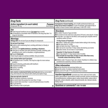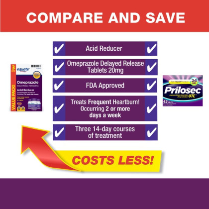 About This Item We aim to show you accurate product information. Manufacturers, suppliers and others provide what you see here, and we have not verified it. See our disclaimer COmeprazole Delayed Release Tablets 20 mg, acid reducer, treats frequent heartburn occurring 2 or more days per week. The active ingredient is omeprazole 20 mg, a Proton Pump Inhibitor (PPI) that deactivates pumps in the stomach lining to inhibit acid production at the source. Taken once every 24 hours for 14 days, Omeprazole Delayed Release Tablets 20 mg is not intended for immediate relief of heartburn and may take 1 to 4 days for full effect. Compare to Prilosec OTC®. Made in Israel. Equate Omeprazole Delayed Release Tablets 20 mg, 42 Ct: EFFECTIVE: Compare Omeprazole Delayed Release Tablets 20 mg to Prilosec OTC®. The active ingredient in these delayed release tablets is Omeprazole 20 mg. It works as an acid reducer to treat frequent heartburn. TREATS FREQUENT HEARTBURN: These acid reducer pills treat frequent heartburn that occurs 2 or more times a week. ACID REDUCER: Omeprazole 20 mg is a Proton Pump Inhibitor (PPI) that deactivates pumps in the stomach lining to inhibit acid production at the source. 14-DAY COURSE OF HEARTBURN TREATMENT: Taken once every 24 hours for 14 days, Omeprazole Delayed Release Tablets 20 mg is not intended for immediate relief of heartburn and may take 1 to 4 days for full effect. DIRECTIONS FOR ACID REDUCER: For adults 18 years of age and older; this product is to be used once a day (every 24 hours), every day for 14 days; it may take 1 to 4 days for full effect; some people get complete relief of symptoms within 24 hours. 14-Day Course of Treatment: swallow 1 tablet with a glass of water before eating in the morning; take every day for 14 days; do not take more than 1 tablet a day; do not use for more than 14 days unless directed by your doctor; swallow whole. Do not chew or crush tablets. Repeated 14-Day Courses (if needed): you may repeat a 14-day course every 4 months; do not take for more than 14 days or more often than every 4 months unless directed by a doctor. Children under 18 years of age: ask a doctor. Heartburn in children may sometimes be caused by a serious condition.