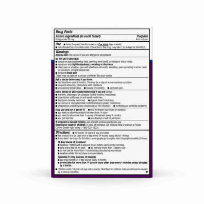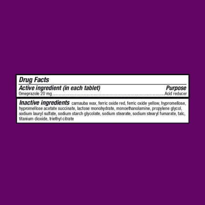 About This Item We aim to show you accurate product information. Manufacturers, suppliers and others provide what you see here, and we have not verified it. See our disclaimer COmeprazole Delayed Release Tablets 20 mg, acid reducer, treats frequent heartburn occurring 2 or more days per week. The active ingredient is omeprazole 20 mg, a Proton Pump Inhibitor (PPI) that deactivates pumps in the stomach lining to inhibit acid production at the source. Taken once every 24 hours for 14 days, Omeprazole Delayed Release Tablets 20 mg is not intended for immediate relief of heartburn and may take 1 to 4 days for full effect. Compare to Prilosec OTC®. Made in Israel. Equate Omeprazole Delayed Release Tablets 20 mg, 42 Ct: EFFECTIVE: Compare Omeprazole Delayed Release Tablets 20 mg to Prilosec OTC®. The active ingredient in these delayed release tablets is Omeprazole 20 mg. It works as an acid reducer to treat frequent heartburn. TREATS FREQUENT HEARTBURN: These acid reducer pills treat frequent heartburn that occurs 2 or more times a week. ACID REDUCER: Omeprazole 20 mg is a Proton Pump Inhibitor (PPI) that deactivates pumps in the stomach lining to inhibit acid production at the source. 14-DAY COURSE OF HEARTBURN TREATMENT: Taken once every 24 hours for 14 days, Omeprazole Delayed Release Tablets 20 mg is not intended for immediate relief of heartburn and may take 1 to 4 days for full effect. DIRECTIONS FOR ACID REDUCER: For adults 18 years of age and older; this product is to be used once a day (every 24 hours), every day for 14 days; it may take 1 to 4 days for full effect; some people get complete relief of symptoms within 24 hours. 14-Day Course of Treatment: swallow 1 tablet with a glass of water before eating in the morning; take every day for 14 days; do not take more than 1 tablet a day; do not use for more than 14 days unless directed by your doctor; swallow whole. Do not chew or crush tablets. Repeated 14-Day Courses (if needed): you may repeat a 14-day course every 4 months; do not take for more than 14 days or more often than every 4 months unless directed by a doctor. Children under 18 years of age: ask a doctor. Heartburn in children may sometimes be caused by a serious condition.