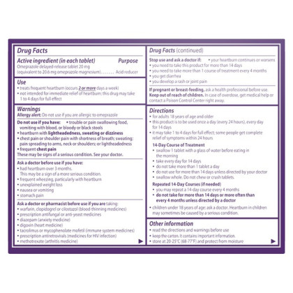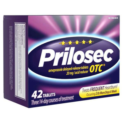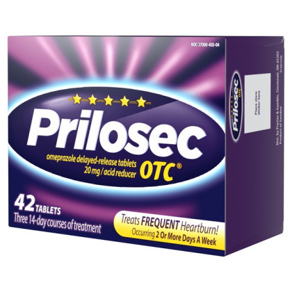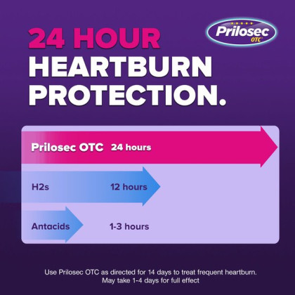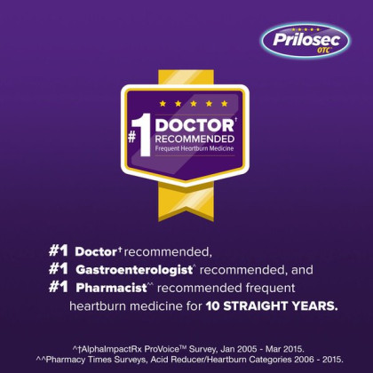 About This Item We aim to show you accurate product information. Manufacturers, suppliers and others provide what you see here, and we have not verified it. See our disclaimer With Prilosec OTC, you can take control of heartburn. If you suffer from frequent heartburn, there’s no need to stash antacids everywhere for whenever heartburn might strike. With Prilosec OTC, you can take 1 PILL A DAY for 24 HOURS of ZERO HEARTBURN.* Prilosec OTC is the first and original over-the-counter frequent heartburn (defined as occurring 2 or more times per week) medicine. The active ingredient in Prilosec OTC is omeprazole magnesium delayed-release tablet 20mg (equivalent to 20.6mg omeprazole), which is part of a class of medications called proton pump inhibitors, or PPIs. PPIs reduce stomach acid production by shutting down many of the pumps in the stomach that produce acid. In other words, Prilosec OTC blocks acid production at its source, so you don’t get heartburn in the first place.* Take Prilosec OTC once a day and use as directed for 14 days to treat frequent heartburn. Prilosec OTC may take 1-4 days for full effect. Prilosec OTC is the #1 Doctor†, Gastroenterologist^ and Pharmacist^^ recommended OTC frequent heartburn medicine. *It’s possible while taking Prilosec OTC. Use as directed for 14 days to treat frequent heartburn. May take 1-4 days for full effect. ±P&G Calculation based in part on Buying Households reported by the Nielsen Company through its Homescan Panel service in the US for Prilosec OTC for the period of 8/31/03 through 6/25/16. †^IQVIA ProVoice™ Survey, Jan 2005 – Mar 2018 ^^Pharmacy Times Surveys, Acid Reducer/Heartburn Categories 2006-2018 Prilosec OTC Frequent Heartburn Relief Medicine and Acid Reducer, 42 Count – Omeprazole Delayed-Release Tablets 20mg - Proton Pump Inhibitor: ONE PILL A DAY. 24 HOURS. ZERO HEARTBURN.* With one pill a day, Prilosec OTC blocks acid production at the source so you don't get heartburn in the first place* THE FIRST AND ORIGINAL OVER-THE-COUNTER FREQUENT HEARTBURN MEDICINE. There's a reason 30 Million Americans± used Prilosec OTC to treat their frequent heartburn #1 DOCTOR†, GASTROENTEROLOGIST^, AND PHARMACIST^^ RECOMMENDED frequent heartburn treatment for 13 straight years TREATS FREQUENT HEARTBURN. There's no need to stash antacids everywhere for whenever heartburn might strike. With Prilosec OTC, you can take 1 pill a day for 24 hours of zero heartburn* BLOCKS ACID PRODUCTION AT ITS SOURCE. Proton pump inhibitors (PPIs) like Prilosec OTC reduce stomach acid production by shutting down many of the pumps in the stomach that produce acid