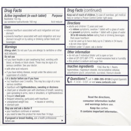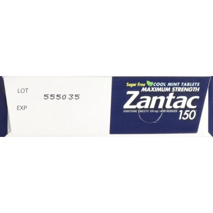 About This Item We aim to show you accurate product information. Manufacturers, suppliers and others provide what you see here, and we have not verified it. See our disclaimer Zantac 150 Tablets Cool Mint Zantac 150 Cool Mint Maximum Strength Ranitidine Acid Reducer Tablets, 24ct Ranitidine tablets 150mg/ Acid Reducer Prevents or relieves heartburn in as little as 30 minutes (1) Lasts up to 12 hours (2) Can be used twice daily for heartburn relief all day and all night (3) No pill relieves heartburn faster (4) Contains the clinically proven active ingredient ranitidine Sugar free Sodium free (1) Heartburn relief in 30 to 60 minutes or prevention when taken 30 to 60 minutes before eating or drinking (2) Controls acid for up to 12 hours, day or night (3) Do not take more than 2 tablets in 24 hours. Controls acid for up to 12 hours, day or night. (4) Does not include chewables