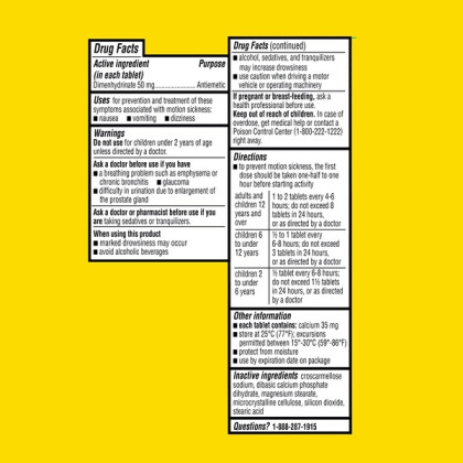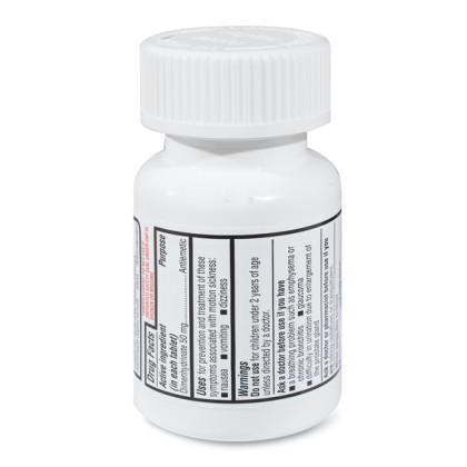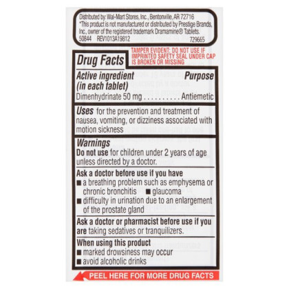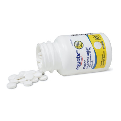 About This Item We aim to show you accurate product information. Manufacturers, suppliers and others provide what you see here, and we have not verified it. See our disclaimer An upcoming plane or boat voyage may be rough, but its easier to get through with these Equate Fast-Acting Motion Sickness Relief Dimenhydrinate Tablets. They contain a fast-acting formula that works quickly to prevent nausea, dizziness and other symptoms related to motion sickness. These Equate tablets come in a 100-count bottle and are convenient to take along, while you are traveling or simply having fun. Each of them contain 50 mg of dimenhydrinate and they are suitable for adults, as well as kids as young as 2 years old. They are also ideal for taking when getting carsick or any other time when motion sickness, nausea or dizziness hit. Making the right health decisions can be challenging. With a complete range of products and simple solutions, Equate allows you to take care of your family with confidence. Equate Motion Sickness Relief Tablets, 100 Count: For the prevention and treatment of nausea, vomiting or dizziness associated with motion sickness Fast-acting motion sickness tablets Safe for children and adults Includes 100-count Equate motion sickness relief tablets 50mg active ingredient in each tablet Contains dimenhydrinate as active ingredient Compare to the active ingredient in Dramamine tablets For best results, take 1-2 tablets 30-60 minutes before starting activity that causes symptoms, then repeat dose every 4-6 hours as needed