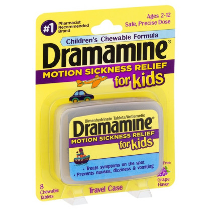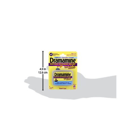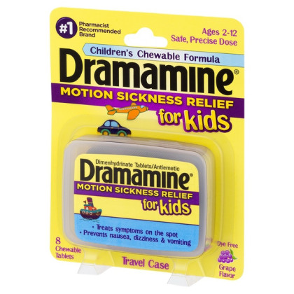 About This Item We aim to show you accurate product information. Manufacturers, suppliers and others provide what you see here, and we have not verified it. See our disclaimer - The only medicated motion sickness relief product formulated just for children ages 2-12 - Treats and prevents nausea, dizziness and vomiting - Safe, precise dose in a fun, chewable grape flavor - #1 Pharmacist Recommended brand for motion sickness - 8 chewable tablets in a travel case Dramamine for Kids is the only medicated motion sickness relief product formulated just for children ages 2-12 from the #1 Pharmacist Recommended brand. It treats symptoms on the spot, preventing nausea, dizziness and vomiting. Dramamine for Kids has a safe, precise dose in a fun, chewable grape flavor, and it comes in a convenient, portable travel case ideal for car rides, boat rides, and airplane trips! Always bring Dramamine with you! You don't want to be caught in the air, on the water, or on the road without Dramamine. Thirty three percent of all kids ages 2-12 suffer from motion sickness. Dramamine is the only leading brand to have developed a solution formulated specifically for children 2 years and older, not only preventing nausea, dizziness and vomiting, but also treating symptoms on the spot. Here are some tips: 1. If your child is prone to motion sickness or if he/ she unexpectedly begins to feel motion sick during a trip, tell him or her to look out at the horizon and focus on a non-moving object. An older child might feel better sitting in the front seat, too. 2. Get fresh air. Sit outdoors with your child (on a boat) or open a window (in a car or bus) when possible. The fresh air helps distract from those oogly-booglies. 3. The last thing a parent wants to hear from a child is, “I’m gonna be sick!” This is why one of the most important items to pack when traveling with children is a bag or bucket. Be sure to keep it close at hand, too. It won’t do you any good buried beneath a pile of suitcases in the trunk. 4. Ginger is a spice renowned for its ability to soothe an upset tummy. Pack a few ginger-infused, low-sugar candies in your day-pack as a sweet distraction for your little one during your journey. 5. Use a distraction. Take your child’s mind off the motion sickness by playing music (on headphones on a plane). Anything that requires too much thinking, like playing a game or reading books, probably will just make things worse. 6. Pack some protein. Avoid giving your child too many sugary treats, which can make them shaky. Don’t overeat either. Instead, stick to small, protein-packed snacks like a handful of nuts, a protein bar, or peanut butter crackers. Not only is Dramamine the most trusted over-the-counter treatment for motion sickness, it is the #1 Pharmacist Recommended brand to both prevent and treat the condition.
