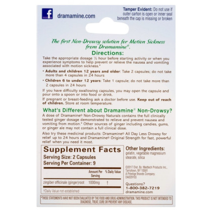 About This Item We aim to show you accurate product information. Manufacturers, suppliers and others provide what you see here, and we have not verified it. See our disclaimer - Dramamine’s first non-drowsy offering - Contains the clinically tested ginger dosage required for preventing and treating motion sickness - Prevents and treats the symptoms of motion sickness (nausea and vomiting) without drowsiness - Safe to use every day you travel since it’s made from natural ginger - 18 capsules Dramamine Non-Drowsy Naturals is the first non-drowsy solution for motion sickness from Dramamine. The product contains the clinically tested ginger dosage required for preventing and treating motion sickness. Other sources of ginger, including candies, gums, or ginger ale, may not contain a full clinical dose. It prevents and treats the symptoms of motion sickness (nausea and vomiting) without drowsiness. Dramamine Non-Drowsy Naturals is safe to use every day you travel, since it’s made from natural ginger, and it is safe for children ages 6 and up. Always bring Dramamine with you! You don't want to be caught in the air, on the water, or on the road without Dramamine. Depending on the cause, motion sickness is also referred to as airsickness, carsickness or seasickness. Here are some tips to help: 1. Whether on a cruise ship, a jetliner or a sailboat—the middle of the vessel tends to be the steadiest. Stay mid-boat at sea or reserve a seat over the wings when flying to avoid too many nauseating ups and downs. 2. If you know you are going on a rocky ocean-fishing adventure or helicopter tour that is likely to cause motion sickness, take Dramamine BEFORE boarding. Dramamine works best when taken as a precautionary measure. It also eases motion sickness after the fact, but why risk getting sick? 3. Take a turn at the wheel. Driving the car or small watercraft may distract you from feeling nauseous. Ask your friends if you can act as a captain. If you begin to feel motion sick and can’t drive, at least sit in the front seat. You’ll feel better if you can face the direction in which you’re headed and stare at a non-moving object. 4. Steer clear of fumes. Ferryboats, in particular, seem to chug out a lot of stinky exhaust that can make a seagoer go from slightly motion sick to all-out nauseated. 5. Toast your besties with a glass of bubbly ginger ale or stick to bottled water and focus on staying hydrated. Avoid alcohol, which can increase dehydration and nausea. Not only is Dramamine the most trusted over-the-counter treatment for motion sickness, it is the #1 Pharmacist Recommended brand to both prevent and treat the condition.