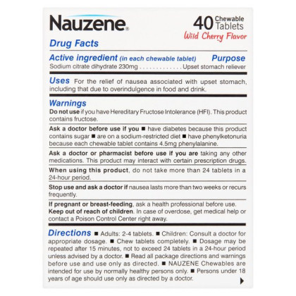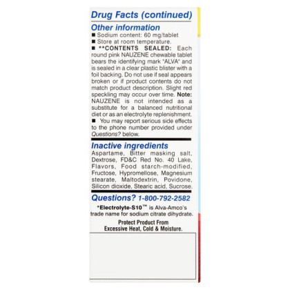 About This Item We aim to show you accurate product information. Manufacturers, suppliers and others provide what you see here, and we have not verified it. See our disclaimer Wild Cherry Flavor Chewable Tablets • Electrolyte S-10™* *Electrolyte-S-10™ is Alva-Amco's trade name for sodium citrate dihydrate. • 4 Minute Formula™† for Prompt Relief † In laboratory tests, Nauzene reaches 99% of its acid neutralizing ability within 4 minutes. Uses For the relief of nausea associated with upset stomach, including that due to overindulgence in food and drink. Drug Facts Active ingredient (in each chewable tablet) - Purpose Sodium citrate dihydrate 230mg - Upset stomach reliever Product Features New improved taste! For upset stomach & nausea Can be used after over-indulging Doctor recommended Fast relief No aspirin No salicylates Contains no gluten ingredients