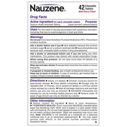 About This Item We aim to show you accurate product information. Manufacturers, suppliers and others provide what you see here, and we have not verified it. See our disclaimer >p> Doctor Recommended Nauzene Chewable Tablets with a Great Cherry Flavor. Four-minute formula for Upset Stomach and Nausea. Nauzene Nausea Relief Chewable Tablets Wild Cherry Flavor, 42 CT: Doctor recommended 4-minute upset stomach and nausea relief formula Quick dissolving chewable tablets Delicious wild cherry flavor no caffeine, antihistamines, aspirin, or salicylates Relieves stomach discomfort Can be used after over-indulging