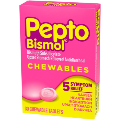 About This Item We aim to show you accurate product information. Manufacturers, suppliers and others provide what you see here, and we have not verified it. See our disclaimer Pepto Bismol Original Chewable Tablets. When you have a sour stomach, Pepto's coating action calms and soothes your symptoms, providing fast digestive relief from nausea, heartburn, indigestion, upset stomach, and diarrhea. Pepto Bismol Chewable Tablets for Nausea, Heartburn, Indigestion, Upset Stomach, and Diarrhea Relief, Original Flavor 30 ct: 5 SYMPTOM Digestive Relief: Nausea, Heartburn, Indigestion, Upset Stomach, Diarrhea The #1 Pharmacist Recommended Brand for Upset Stomachs (Based on Pharmacy Times 2018 Survey-upset stomach remedies category) Power of Pepto in a chewable for portable relief Bismuth Subsalicylate Whether you're looking for an upset stomach medicine or nausea help, wondering what to do for ingestion or heartburn relief, or trying to find what's good for diarrhea, Pepto has a coating action to calm and soothe your sour stomach