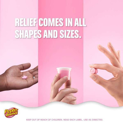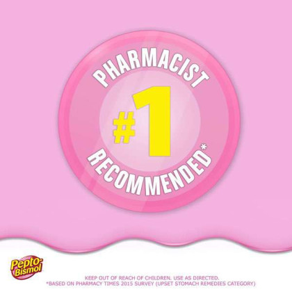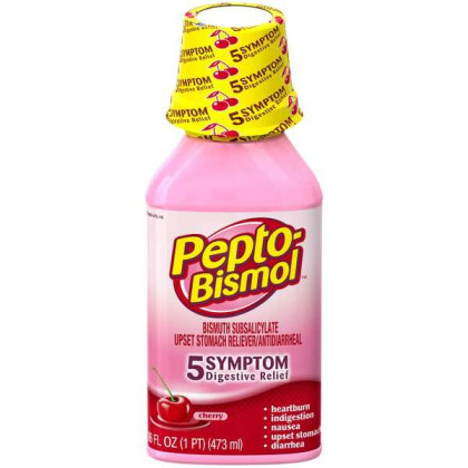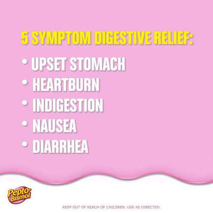 About This Item We aim to show you accurate product information. Manufacturers, suppliers and others provide what you see here, and we have not verified it. See our disclaimer Pepto Bismol Cherry Liquid. When you have a sour stomach, Pepto's improved formula coats your stomach and provides fast relief from nausea, heartburn, indigestion, upset stomach, and diarrhea. Pepto Bismol Liquid for Nausea, Heartburn, Indigestion, Upset Stomach, and Diarrhea Relief, Cherry Flavor 16 oz: 5 SYMPTOM Digestive Relief: Nausea, Heartburn, Indigestion, Upset Stomach, Diarrhea (Packaging may vary) The #1 Pharmacist Recommended Brand for Upset Stomachs (Based on Pharmacy Times 2018 Survey-upset stomach remedies category) Pepto's formula now has improved coating to calm and soothe your stomach Bismuth Subsalicylate Whether you're looking for an upset stomach medicine or nausea help, wondering what to do for indigestion or heartburn relief, or trying to find what's good for diarrhea, Pepto provides fast relief