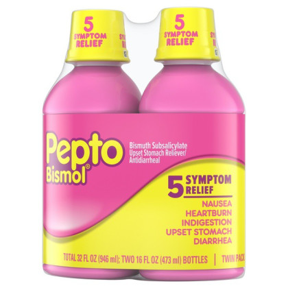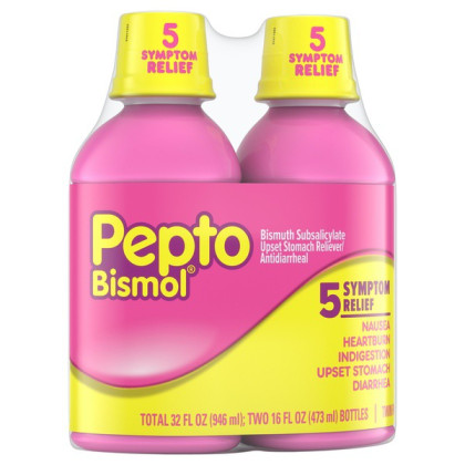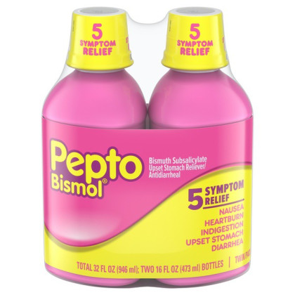 About This Item We aim to show you accurate product information. Manufacturers, suppliers and others provide what you see here, and we have not verified it. See our disclaimer Pepto Bismol Original Liquid. When you have a sour stomach, Pepto's improved formula coats your stomach and provides fast relief from nausea, heartburn, indigestion, upset stomach, and diarrhea. Pepto Bismol Liquid for Nausea, Heartburn, Indigestion, Upset Stomach, and Diarrhea Relief, Original Flavor 2x16 oz: 5 SYMPTOM Digestive Relief: Nausea, Heartburn, Indigestion, Upset Stomach, Diarrhea The #1 Pharmacist Recommended Brand for Upset Stomachs (Based on Pharmacy Times 2018 Survey-upset stomach remedies category) Pepto's formula now has improved coating to calm and soothe your stomach Bismuth Subsalicylate Whether you're looking for an upset stomach medicine or nausea help, wondering what to do for indigestion or heartburn relief, or trying to find what's good for diarrhea, Pepto provides fast relief