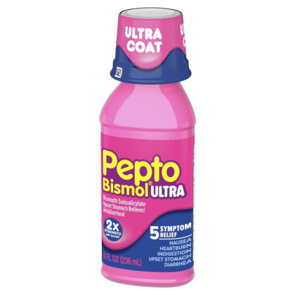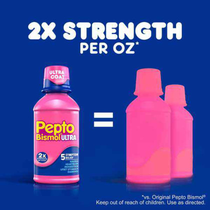 About This Item We aim to show you accurate product information. Manufacturers, suppliers and others provide what you see here, and we have not verified it. See our disclaimer Pepto Bismol Ultra Strength-Original Flavor. When you have a sour stomach, Pepto's improved formula coats your stomach and provides fast relief from nausea, heartburn, indigestion, upset stomach, and diarrhea. Pepto Bismol ULTRA STRENGTH has got you covered. Pepto Bismol Liquid Ultra for Nausea, Heartburn, Indigestion, Upset Stomach, and Diarrhea Relief, Original Flavor 8 oz: 5 SYMPTOM Digestive Relief: Nausea, Heartburn, Indigestion, Upset Stomach, Diarrhea (Packaging may vary) The #1 Pharmacist Recommended Brand for Upset Stomachs (Based on Pharmacy Times 2018 Survey-upset stomach remedies category) Pepto's formula now has improved coating to calm and soothe your stomach Bismuth Subsalicylate Whether you're looking for an upset stomach medicine or nausea help, wondering what to do for indigestion or heartburn relief, or trying to find what's good for diarrhea, Pepto provides fast relief