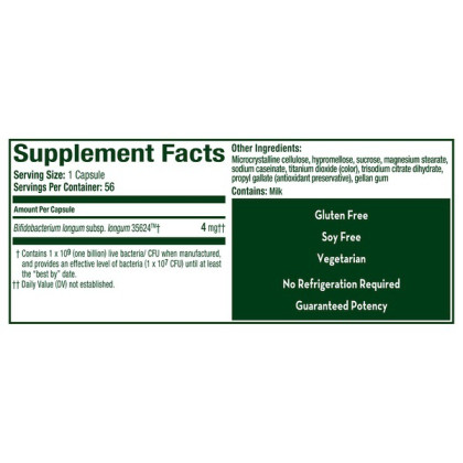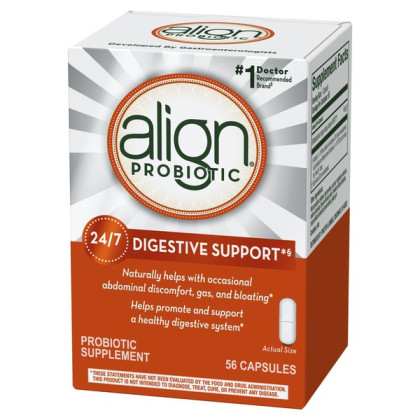 About This Item    We aim to show you accurate product information.   Manufacturers, suppliers and others provide what you see here, and we have not verified it.   See our disclaimer       Good bacteria are essential for many bodily functions, including healthy digestion. However, common issues such as diet, travel and stress can disrupt the natural balance of bacteria in your digestive system. Align is a daily probiotic supplement that fortifies your gut with good bacteria to help you maintain digestive balance.* Align contains the patented probiotic strain Bifidobacterium 35624 and is the #1 doctor and gastroenterologist recommended probiotic brand.‡    *THESE STATEMENTS HAVE NOT BEEN EVALUATED BY THE FOOD AND DRUG ADMINISTRATION. THIS PRODUCT IS NOT INTENDED TO DIAGNOSE, TREAT, CURE, OR PREVENT ANY DISEASE.    ‡Among Doctors who recommended a brand of probiotic in a ProVoice 2018 survey.  ‡Among Gastroenterologists who recommended a brand of probiotic in a ProVoice 2008-2018 survey.  Align Probiotics, Probiotic Supplement for Daily Digestive Health, 56 capsules, #1 Recommended Probiotic by Gastroenterologists:     24/7 DIGESTIVE SUPPORT. Align Probiotic Supplement, for men and women, naturally helps with occasional abdominal discomfort, gas, and bloating. One capsule a day, taken with or without food, helps to maintain your digestive system's natural balance   #1 GASTROENTEROLOGIST RECOMMENDED PROBIOTIC for 10 years in a row. Align Probiotic is recommended more often by Gastroenterologists and Doctors than any other probiotics brand   EFFECTIVE & PATENTED STRAIN discovered by Gastroenterologists and backed by >15 yrs of research. Only Align contains the patented probiotic strain, Bifidobacterium 35624, which works naturally to supplement your digestive system with good bacteria   100% SATISFACTION GUARANTEED, OR YOUR MONEY BACK. Align Probiotic Supplement is heat-foil seal wrapped to ensure survivability, and each lot is DNA tested to ensure effective levels of Bifidobacterium 35624   THERE'S MORE TO PROBIOTICS THAN JUST BILLIONS OF CFUs. Align is formulated with high quality ingredients and contains an effective level of CFUs and live cultures. Align Probiotics are gluten free, soy-free, vegetarian, and no refrigeration is required