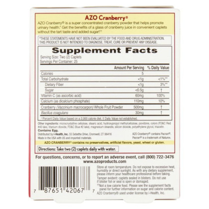 About This Item We aim to show you accurate product information. Manufacturers, suppliers and others provide what you see here, and we have not verified it. See our disclaimer Cranberry Supplement 1 Serving = 1 Glass of Cranberry Juice\xe2\x96\xb4 \xe2\x96\xb4Biological activity of 10Oz cranberry juice cocktail Helps cleanse & protect the urinary tract* AZO Cranberry is a super concentrated cranberry powder that helps promote urinary health.* Get the benefits of a glass of cranberry juice in convenient caplets without the tart taste and added sugar!\xe2\x9c\x9d\xe2\x9c\x9d *This statement has not been evaluated by the Food and Drug Administration. This product is not intended to diagnose, treat, cure or prevent any disease. \xe2\x9c\x9d\xe2\x9c\x9dNot a low calorie food. Please see the supplement facts panel for further information on sugar and calorie content. Cranberry, Caplets Cranberry Supplement. Urinary tract health. Helps flush to maintain urinary tract cleanliness. With probiotic and vitamin C. 1 serving = 1 glass of cranberry juice (biological activity of 10 oz cranberry juice cocktail). No. 1 most trusted brand. Azo Cranberry is a super concentrated cranberry powder that helps promote urinary health. Get the benefits of a glass of cranberry juice in convenient caplets without the tart taste and added sugar! Azo Cranberry contains no preservatives, artificial flavors, yeast, wheat or gluten. For questions, concerns, or to report an adverse event, call (800) 722-3476. www.azoproducts.com. Most trusted brand based on Nielsen data through 4/19/14 and the 2013 Pharmacy Times OTC Survey. (This statement has not been evaluated by the Food and Drug Administration. This product is not intended to diagnose, treat, cure or prevent any disease.) imported materials.