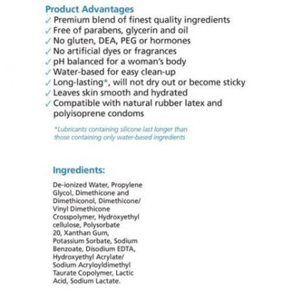 About This Item We aim to show you accurate product information. Manufacturers, suppliers and others provide what you see here, and we have not verified it. See our disclaimer ONE Oasis Silk Lubricant, 8 oz - ONE Oasis Silk is a premium hybrid lubricant developed with doctors and sexual health experts. The advanced, moisturizing formula is long-lasting for more pleasurable intimate activity. ONE Oasis Silk is a hybrid lubricant specially formulated to contain the optimal amounts of both water and silicone to provide the advantages of both experiences;Longer lasting and silky; Easy to clean;pH balanced for a woman's body;Tested and proven compatible with silicone toys;Compatible with latex condoms and polyisoprene condoms;Leaves skin smooth and hydrated;Oasis Silk may be used during sex or anytime to alleviate discomfort and dryness;No gluten, DEA, PEG, hormones, parabens, glycerin, oil, artificial dyes or fragrances; 8 oz pump bottle