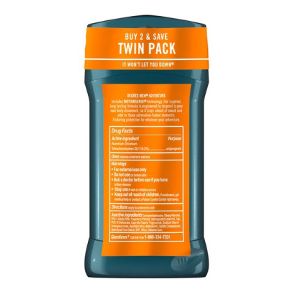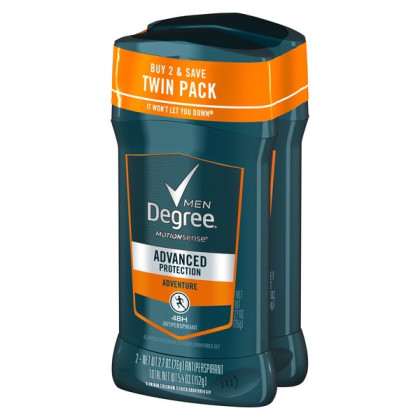 About This Item We aim to show you accurate product information. Manufacturers, suppliers and others provide what you see here, and we have not verified it. See our disclaimer Degree Men Advanced Protection Antiperspirant Deodorant - Cool Rush 2.7 oz, 2-Pack with long lasting MotionSense Technology provides superior motion activated protection to give you powerful sweat and odor protection with fresh fragrance for a great way to start your day. An active life can lead to sweating and body odor. Degree Men Cool Rush provides enduring protection with a burst of crisp, arctic freshness, all day. This antiperspirant deodorant's long-lasting protection will keep you free from body odor and sweat for those moments when life demands more from you. Its 48-hour protection keeps you moving, and helps you stay confident and free to live life to its fullest. Only Degree MotionSense Technology keeps you fresher with every move. Degree MotionSense Technology works like this: unique microcapsules sit on the surface of your skin. When you move, friction breaks those microcapsules and they release more fragrance. So every time you move, Advanced Protection keeps you fresh and free from odor. This powerful antiperspirant deodorant responds when you need it most so that you can stay confident without having to worry about slowing down. Degree Men Cool Rush Antiperspirant Deodorant is also available in a compressed Dry Spray. The more you move, the more it protects, so you can expect more from Degree Men Cool Rush. Degree. It won't let you down. Degree Men Advanced Protection Antiperspirant Deodorant Adventure 2.7 oz, 2-Pack Degree Men Advanced Protection Antiperspirant Deodorant Cool Rush 2.7 oz, 2-Pack features a burst of arctic freshness. Superior Motion Activated Protection Only Degree MotionSense Technology keeps you fresher with every move The more you move, the more it protects Helps keep you fresh and energized Powerful, long-lasting sweat and odor protection