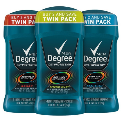 About This Item We aim to show you accurate product information. Manufacturers, suppliers and others provide what you see here, and we have not verified it. See our disclaimer Degree Men Cool Rush helps keep you fresh and dry, no matter what. A men’s antiperspirant that offers 48 hour Original Protection with an energizing burst of crisp, green arctic freshness. Whether you’re having a long day in the office, playing sport outdoors or working out in the gym you can be confident you’ll be protected from sweat and body odor. Designed by experts to be activated by your body heat, Degree Cool Rush is a men’s antiperspirant deodorant stick that works as hard as you do, keeping you dry when you need it most. As well as being highly effective, Degree Cool Rush has an energizing, crisp scent that will keep you fresh all day. Keep comfortable and confident thanks to Degree Cool Rush’s long-lasting formula that is tough on sweat but not on skin. It comes in an easy-to-use applicator stick - you simply turn the dial to raise the stick, apply a thin layer to your underarms and you’re ready for anything. Stay dry, cool and confident thanks to Degree Men Cool Rush. A men’s antiperspirant stick that offers 48 hour Original Protection with an energizing, crisp scent. Body heat activated Degree Men Cool Rush gives you long-lasting protection when you need it the most. Degree. It won’t let you down. Degree Men Cool Rush Antiperspirant Deodorant 5.4 OZ Degree Men Original Protection Antiperspirant Deodorant - Cool Rush 2.7 oz, 2-Pack provides 24-hour body odor and wetness protection that won’t let you down Men's deodorant that is an invisible solid and goes on clear Body Heat Activated Stay dry all day with this deodorant for men Works well for outdoor sports and workouts Powerful, long-lasting sweat and odor protection